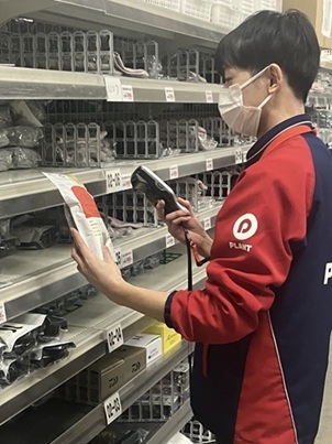 ピッキング・・・・棚に陳列されている商品のバーコードをハンディで読み取って専用カゴへ移動